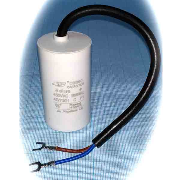 Конденсатор пусковой 8 uF 450 V для электрических двигателей. Выводы гибкие, с клеммами под болт.