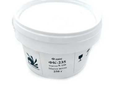 Флюс ФК-235 — мелкодисперсный, однородный порошок для пайки меди, никеля, серебра, их сплавов, сталей. Флюс растворим в воде, легко смывается после пайки. Флюс ФК-235 является отличной заменой стандартных флюсов марок ПВ-284 и ПВ-209.