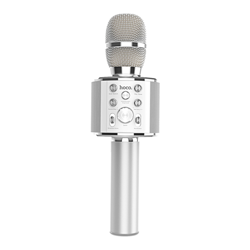 Микрофон Hoco BK3 silver - это вокальный, беспроводной Bluetooth микрофон с встроенным караоке-плеером, поддержкой карт памяти microSD и встроенным динамиком. Благодаря встроенной батарее, ёмкостью 1800mAh, караоке-микрофон Hoco BK3 может работать до 5 часов в активном режиме. Bluetooth микрофон Hoco BK2 обеспечивает совместимость со всеми android или ios гаджетами, колонками, компьютерами и караоке-системами. С беспроводным караоке-микрофоном Hoco BK3 вы сможете практиковаться в пении, слушать музыку и записывать песни.
